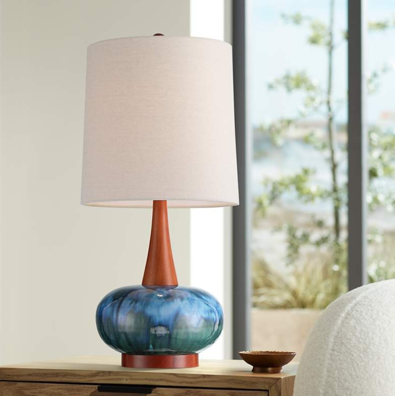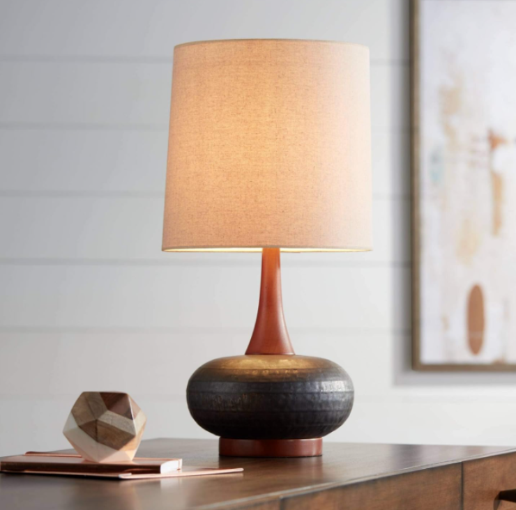 Mid-Century Modern table lamp from 360 Lighting featuring a rounded brown base, slim neck, and fabric shade. UL listed, 24.5" tall, and uses one 100W bulb (not included). Stylish accent for retro, contemporary, or traditional spaces.
