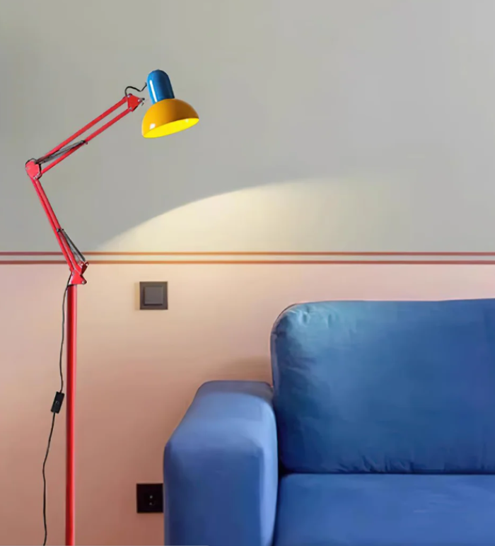 Its distinguishing feature is the freely adjustable mechanical arm, allowing the lamp head to move over a wide range, providing broad-angle lighting. The lamp's blue base paired with a red arm and yellow lampshade creates a bold color combination that is not only eye-catching but also enhances the modernity of the space.