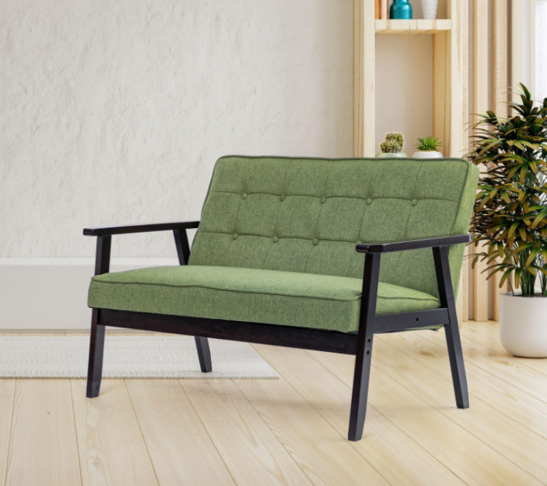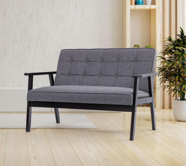Mid-Century Modern accent leisure chair with a timeless design, upholstered fabric seat, and ergonomically curved back for comfort. Crafted with solid wood armrests and legs for durability and warmth. Versatile for living rooms, bedrooms, balconies, or studios. Easy to assemble, measuring 26.8"D x 45.3"W x 33.1"H with a 16.25" seat height.